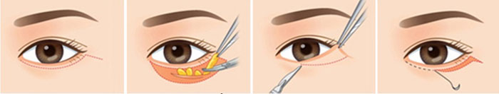 Bác sĩ rạch một đường nhỏ sát bờ mi dưới, loại bỏ mỡ thừa và da chùng. Sau đó khâu lại bằng chỉ thẩm mỹ, đường khâu được giấu sát chân mi nên hầu như không để lộ sẹo.
