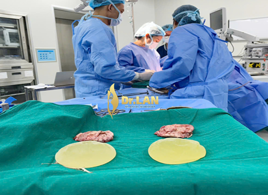 Hình ảnh TS.BS. Hoàng Lan đang trực tiếp thực hiện thay túi độn ngực cho khách hàng tại phòng mổ hiện đại.